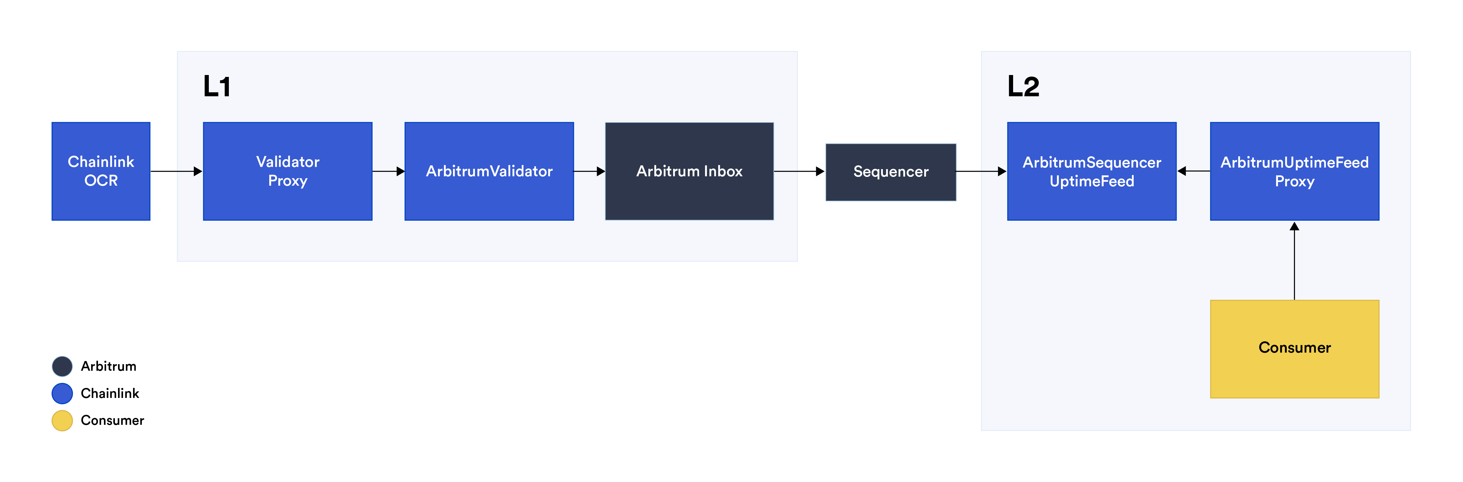 The diagram below shows how these feeds update and how a consumer retrieves the status of the Arbitrum sequencer.