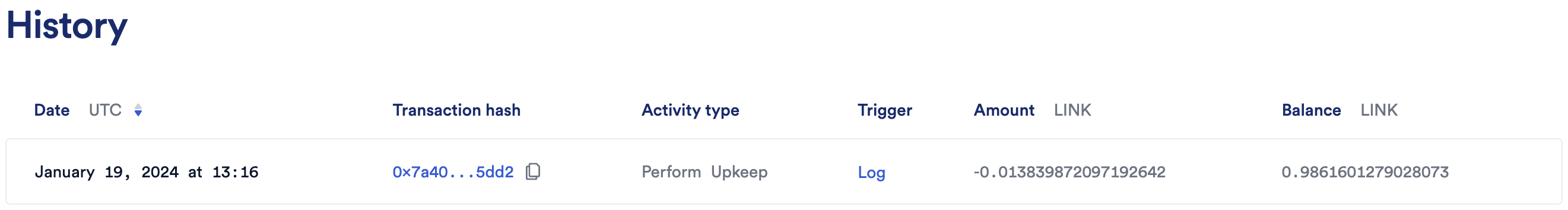 After the transaction is complete, the log is emitted, and the upkeep is triggered. You can find the upkeep transaction hash in the Chainlink Automation UI. Check to make sure the transaction is successful.